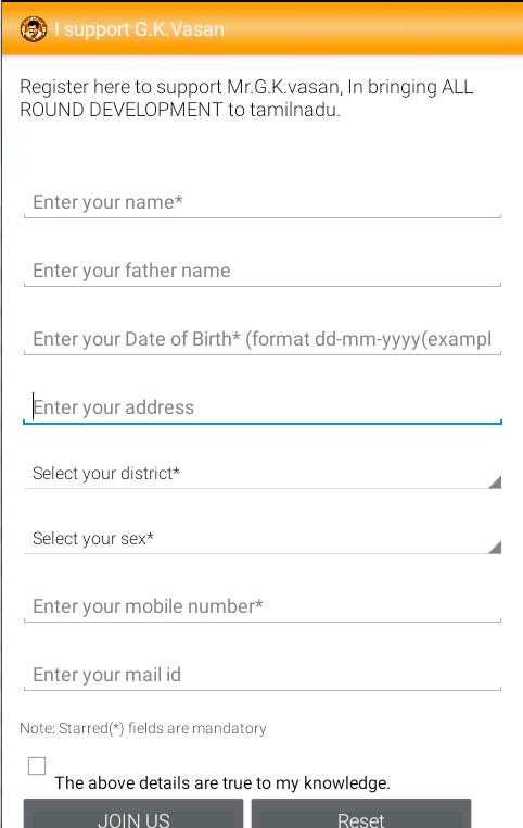 This app is for registering individuals who would like to show their support to Mr.G.K.Vasan,